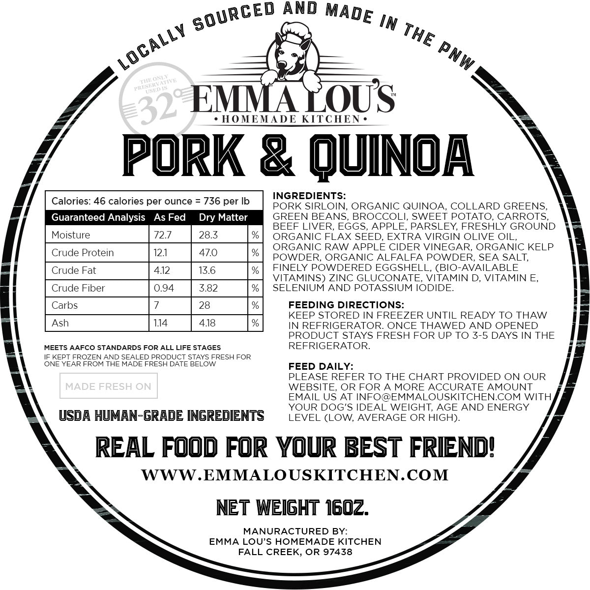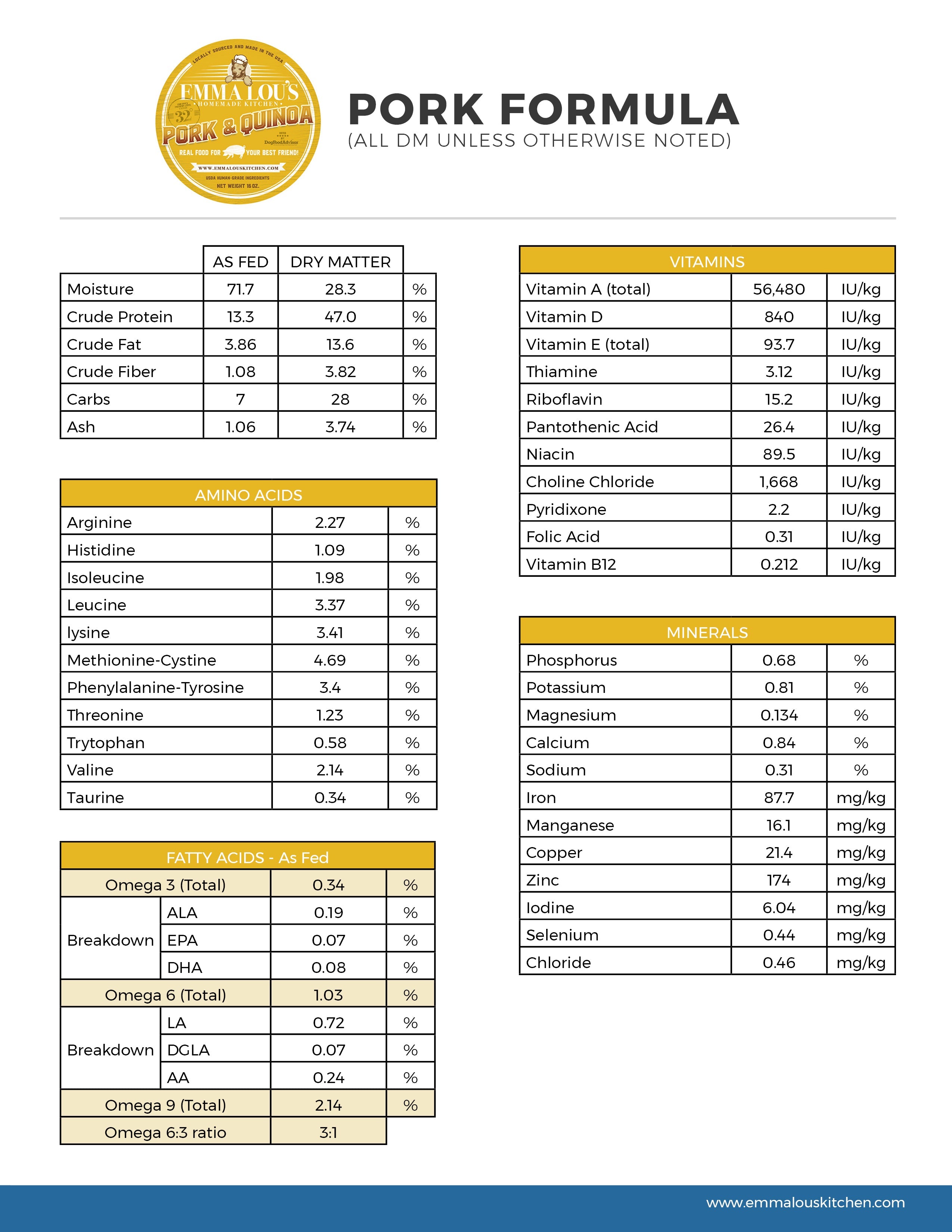 Pork Sirloin, Organic Quinoa, Collard Greens, Green Beans, Broccoli, Sweet Potato, Carrots, Beef Liver, Eggs, Apple, Parsley, Freshly Ground Organic Flax Seed, Extra Virgin Olive Oil, Organic Raw Apple Cider Vinegar, Organic Kelp Powder, Organic Alfalfa Powder, Sea Salt, Finely powdered Eggshell, Zinc Gluconate, Copper Gluconate, Vitamin D, Vitamin E, Selenium, Potassium Iodide.